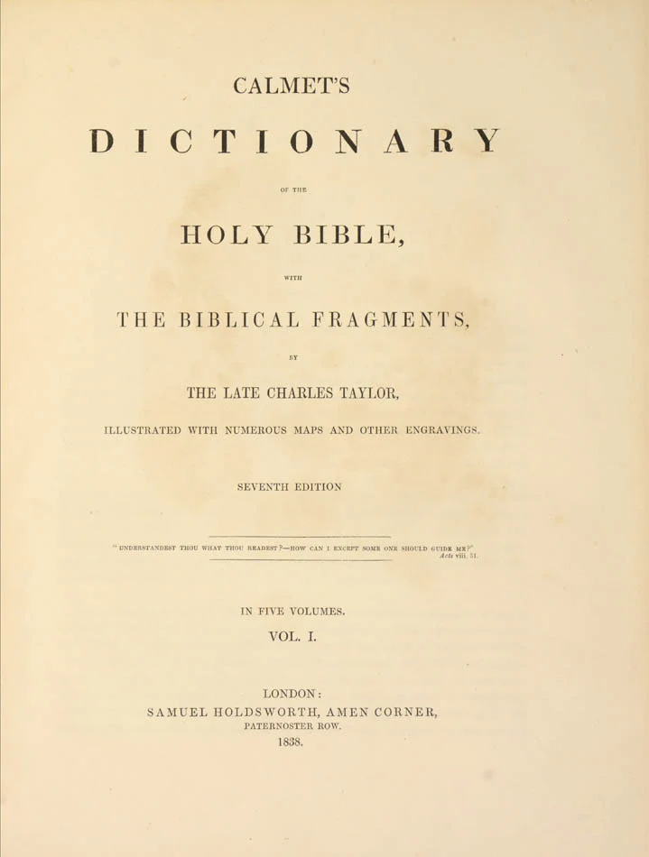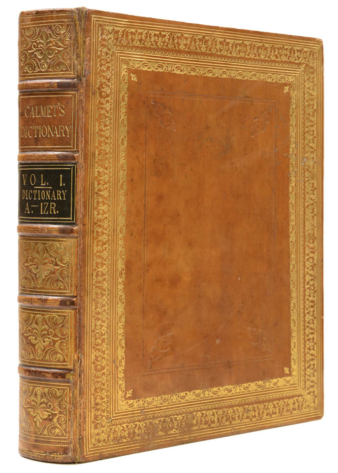 A handsome five-volume set of Calmet's Dictionary of the Holy Bible, rendered into English with commentary and illustrations by the engraver and biblical scholar Charles Taylor (1756-1823).Calmet (1672-1757) is best-known for his pioneering exegetical work, Commentaire littéral sur tous les livres de l'Ancien et du Nouveau Testaments, which departed from the custom of giving allegorical and tropological interpretations of scripture alongside the literal meaning of the text. The topics covered, from Hebrew poetry to burial customs, later formed the basis of his Dictionnaire historique et critique de la Bible,