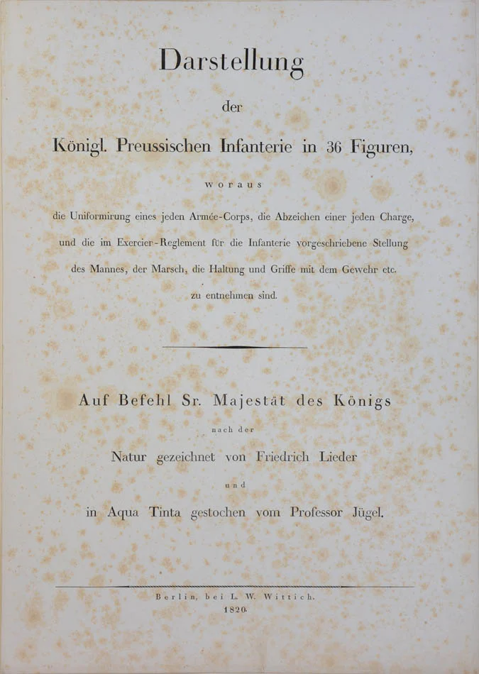 Fourteen exceptionally bright and crisp, hand-coloured prints. The artist, Friedrich Lieder, depicts uniforms and badges for each Prussian army corps, with soldiers performing standard drill movements, including rest posture, marching and rifle gripping, and frequently striking graceful, ballet-like poses. Aquatint engraving was completed by Jügel. The work was reissued in 1827, and a 41-plate edition appeared in 1821.Folio (540 x 390mm); title, contents leaf, and 14 colour aquatints, mounted on tabs, richly and extensively hand-coloured, foxing to title and contents leaf but not affecting plates, which are very fine; mid 19th-century half morocco, over cloth (replaced), replaced endpapers (toned) bearing binder's label for Happel, Rotterdam, rubbed at extremities, otherwise very good.