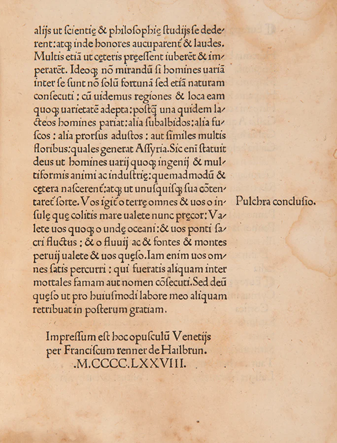 Second separate edition of Dionysius' didactic compendium of geographical descriptions of the known world, translated from the original Greek in prose by the Veronese humanist Antonio Beccaria. Dionysius' work first appeared in print in a free verse translation in Priscian's Opera in 1470 before the first Beccaria edition of 1477.Dionysius was a scholar-poet who flourished in Alexandria during the reign of Hadrian in the second century AD. In antiquity, his description of the world as it was then known was widely read and extremely influential, particularly among later poets. Translated into Latin, the subject of commentaries, and popular in Byzantium, it offers insights into multiple traditions of ancient geography, both literary and more scientific, and displays interesting affiliations to the earlier school of Alexandrian poets. Dionysius of Alexandria, called Periegetes (the guide), was a contemporary of the great Hellenistic geographers Marinus of Tyre and Claudius Ptolemy.