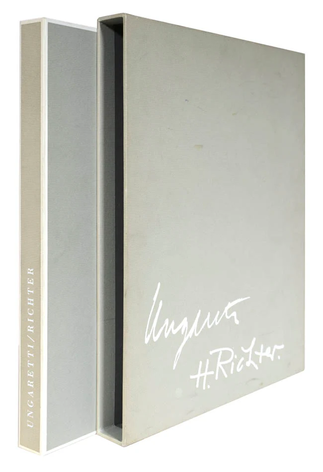 Number 6 of a limited edition of 124, folio (40 x 30 cm), 48 pp., unnumbered, with 2 original colour lithographs by Hans Richter, numbered and signed by the artist (loose as issued), text in parallel Italian and German, reproduction of the original manuscript of the poem, in fine condition, publisher's printed grey paper wrapper, loosely held within grey paper covered folder, housed in a matching slip-case, a little marked and dust-soiled.