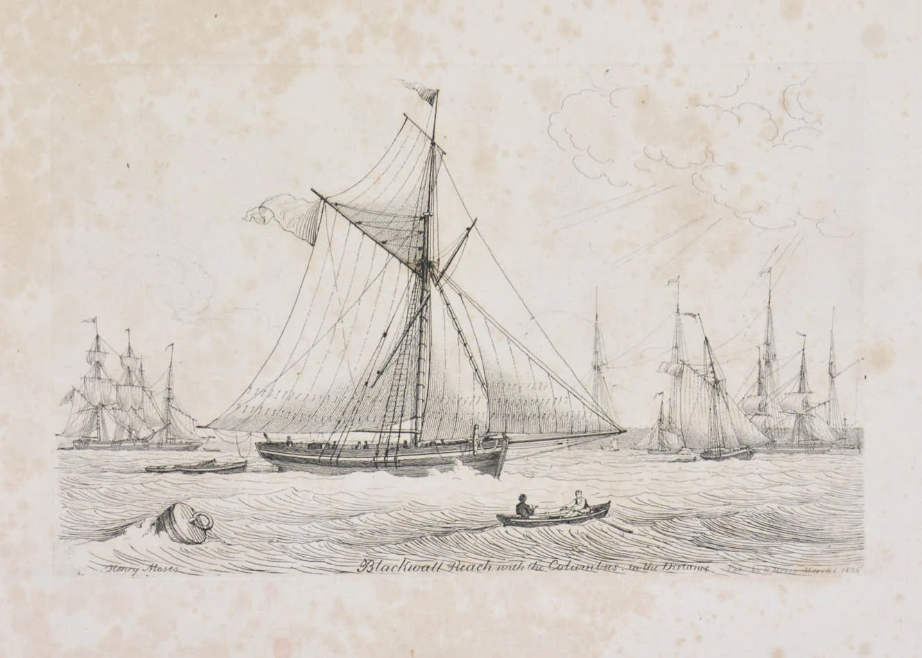Parts 5 & 6 of Henry Moses' (d.1870) Sketches of Shipping, a series of views depicting London's dockyards towards the end of the Age of Sail. An advertisement in the Quarterly Review (1826) shows that Moses had by then published six parts of his Sketches, each containing five views, with a further two series announced.