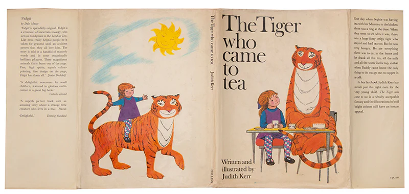 'The work, published in 1968, has been read by several generations and tells the story of a tiger who invites himself to tea and eats and drinks all the food and water in Sophie's house. He then leaves, never to return. "It was just a bedtime story I made up for my daughter when she was two, getting on for three," says Kerr, who also wrote and illustrated the Mog series of picture books.' (Lucy Wallis, BBC interview with the author).