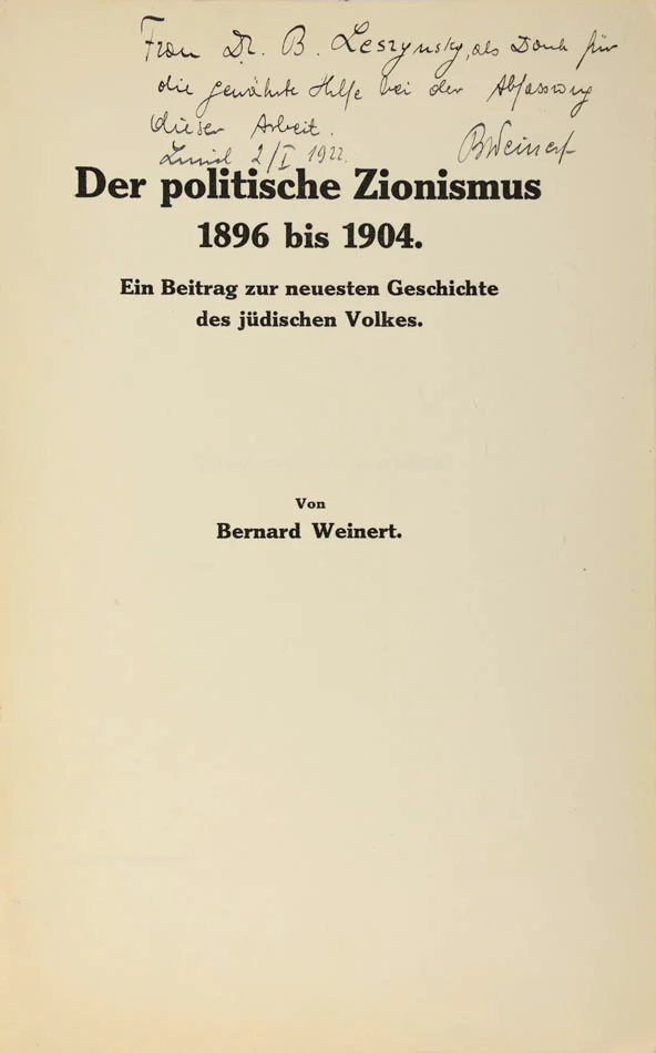 This is the first and only edition of this text, privately printed and issued for private circulation. A presentation copy, signed and inscribed by the author, of his dissertation written at the University of Zurich. This history of political Zionism, from the publication of the 'Judenstaat' up to Herzl's death was printed in the South-West German town of Calw. The authorial inscription on the title translates as 'To Frau Dr. B. Leszynsky, as recognition for the help in writing this work. Zurich [?], January 2, 1922. B Weinert'. The dedicatee is most likely the wife of the Jewish scholar and historian Rudolf Leszynsky (1884-1949).First edition, 8vo; a very good copy in the original printed wrappers; spine sunned, small tear to the front hinge. Inscription by the author to title page. Text in German; iv, 110 pp.